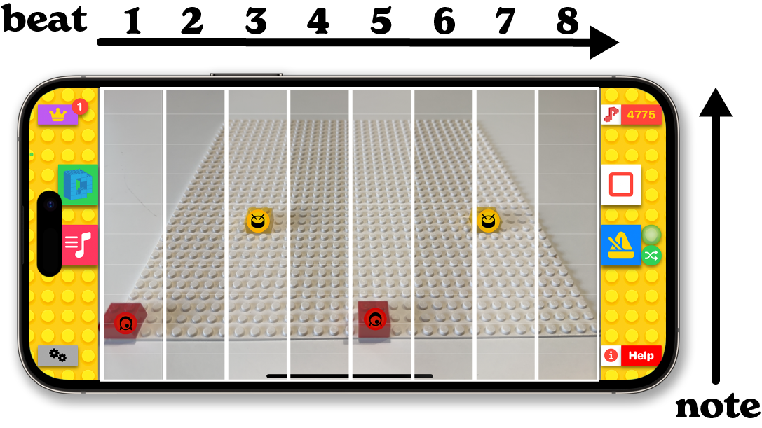 To make music, simply lay a few bricks in front of the camera. Press the play button in the app - a repeating 8-beat loop will play and on every loop, when the app sees a brick, it will play a sound.