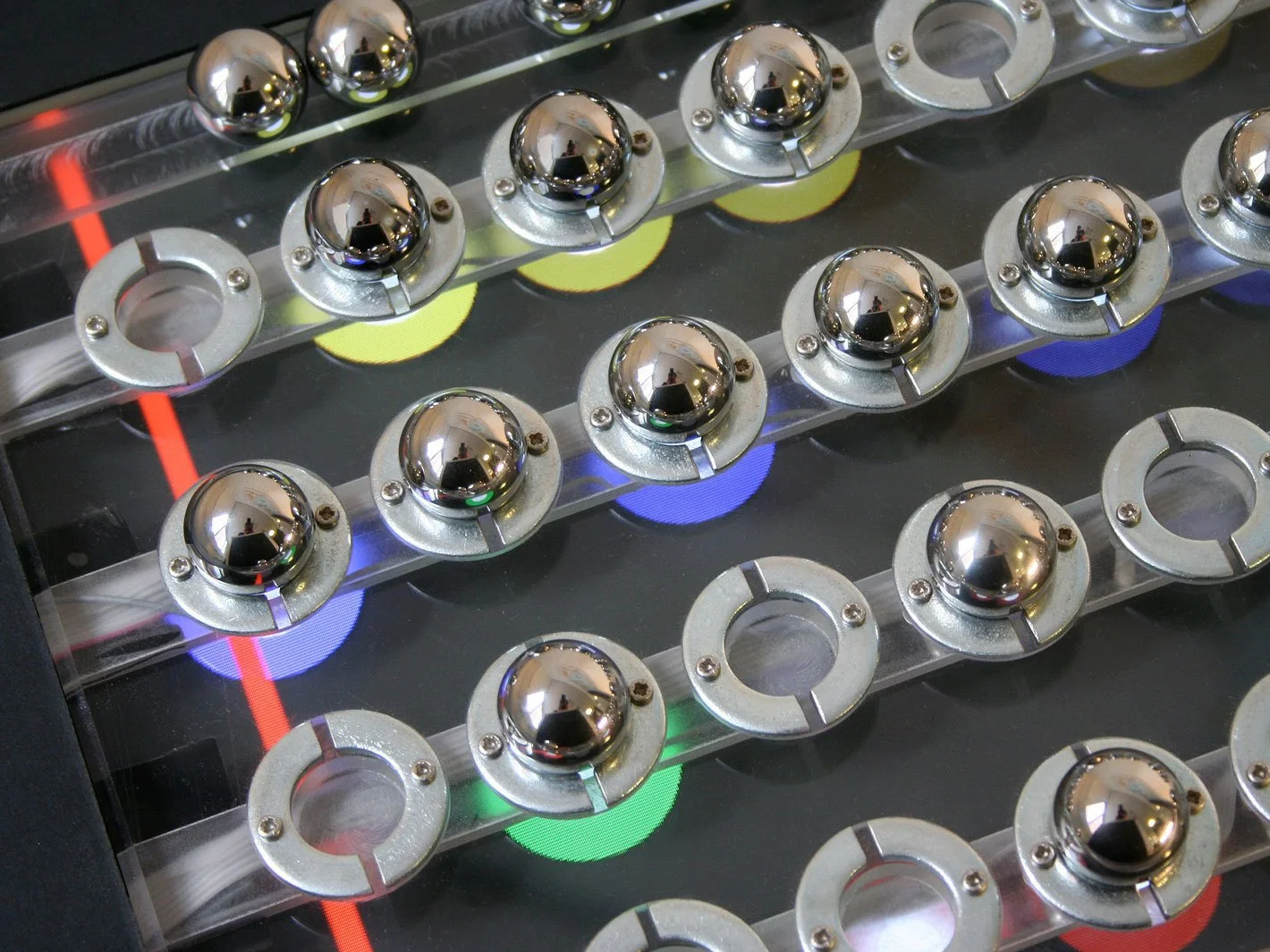 Around the same time, at the Sonic Arts Research Centre (SARC) at Queen's University Belfast, Peter Bennett was developing the BeatBearing, a tangible rhythm sequencer with a simple, effective concept: a transparent grid sitting on top of a screen, with ball bearings serving as notes. Place a bearing on the grid, and it triggers a drum sound at that position in the sequence. A red line sweeps across the screen beneath, showing the current playback position.